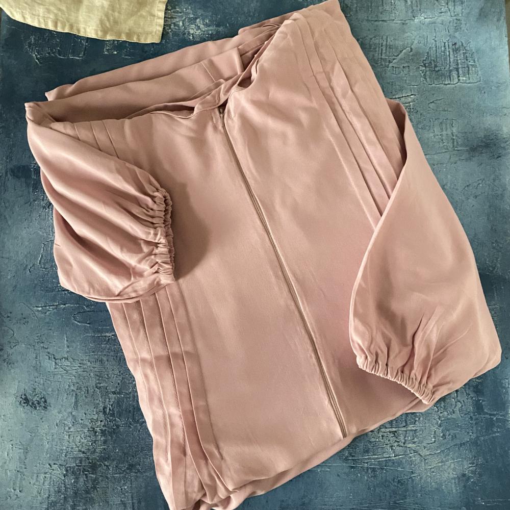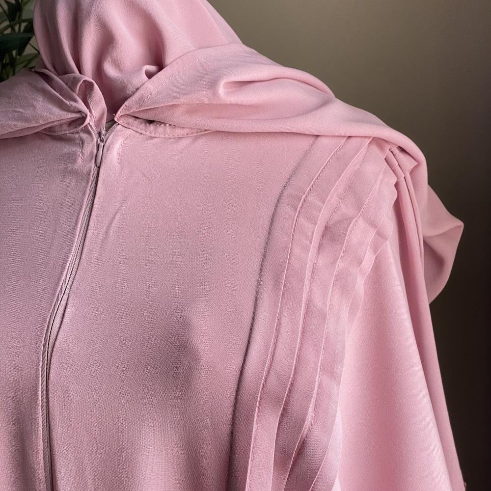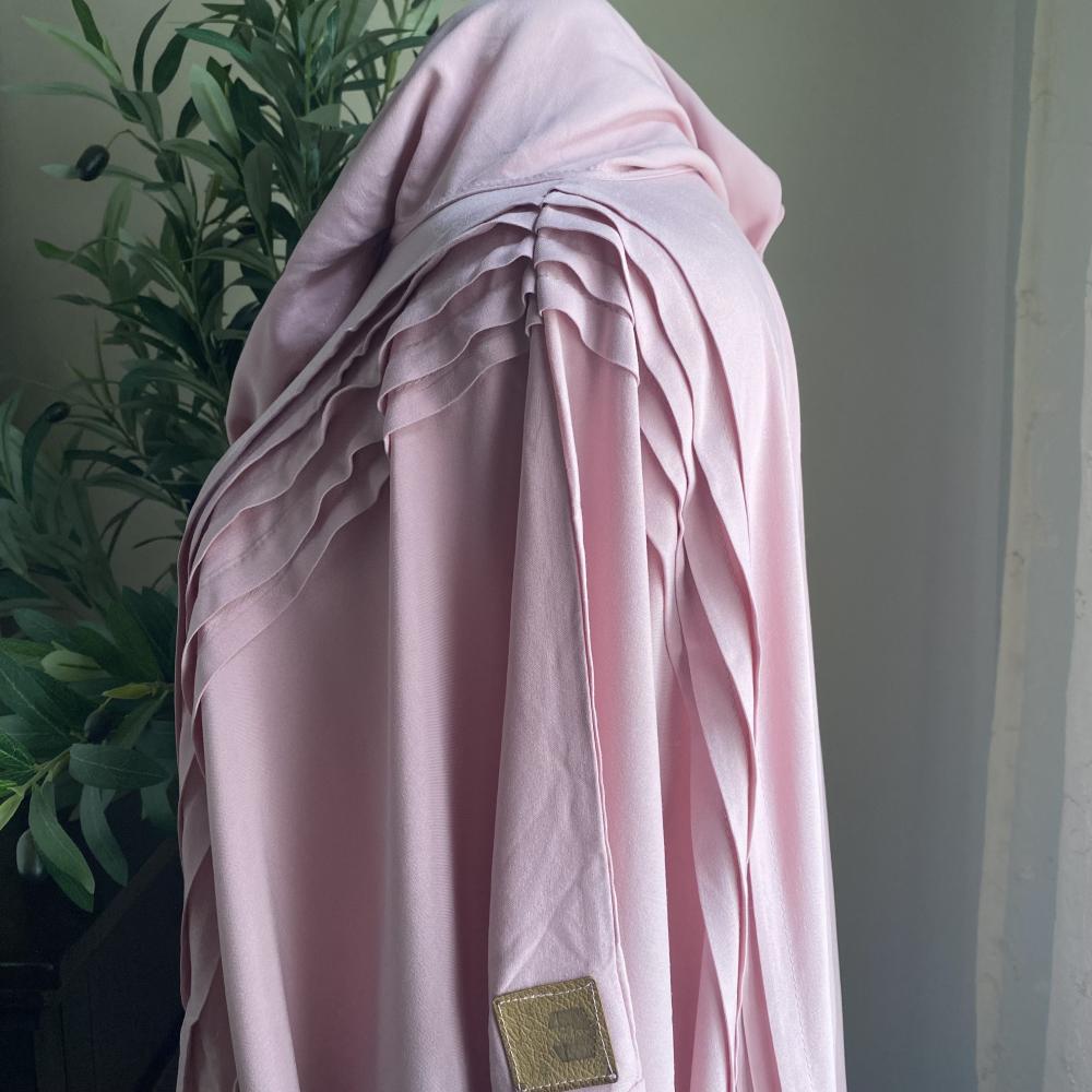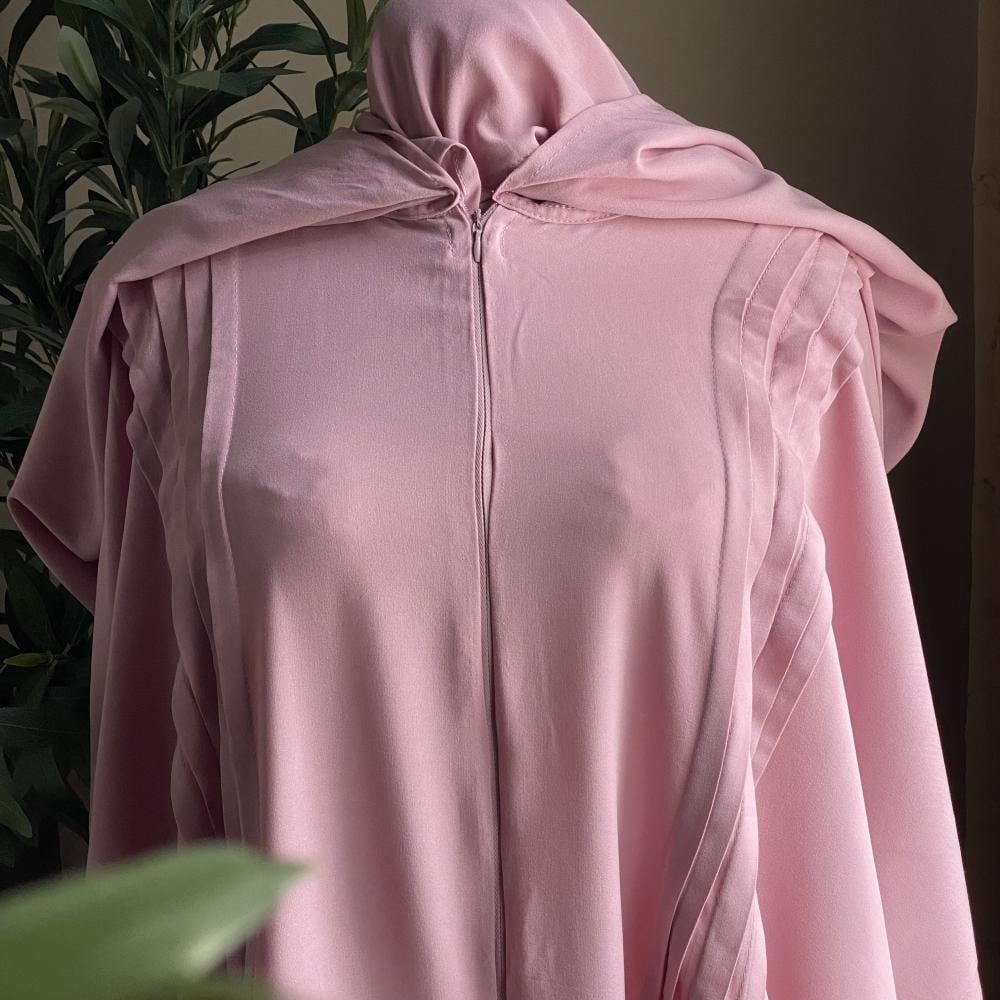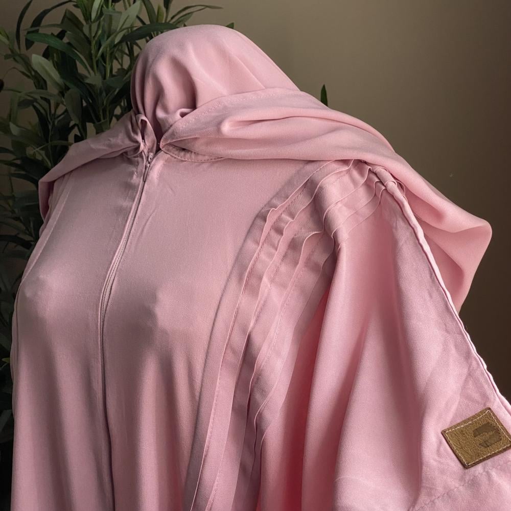 • شرشف صلاة سحاب بكم مطاط باللون الوردي الساده مع ثنيات على الجانبين من الأمام والخلف